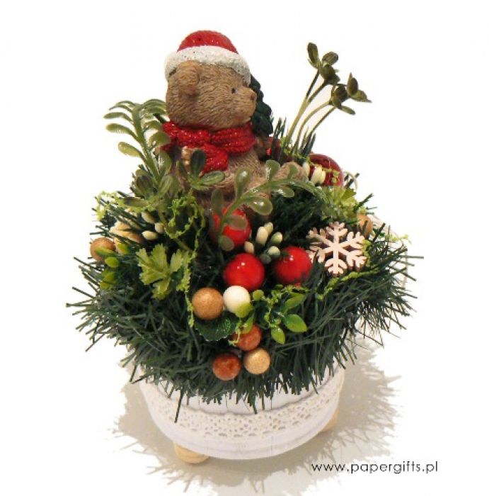 Przepiękna ozdoba bożonarodzeniowa z figurką z żywicy w kształcie Misia z choinką. Dekoracja świąteczna wykonana na metalowej podstawie oklejonej papierem z motywem bielonego drewna i bawełnianą koronką. Ozdobiona sztucznym łańcuchem, bombkami, zielonymi gałązkami, czerwonymi i białymi kuleczkami. Idealna jako ozdoba świątecznego stołu, firmowego biurka lub jako dodatek do prezentu dla bliskiej osoby. Wysokość stroika z dekoracjami ok. 15 cm, średnica podstawy ok. 7 cm.
