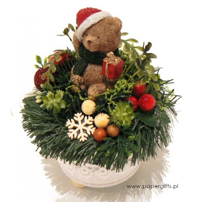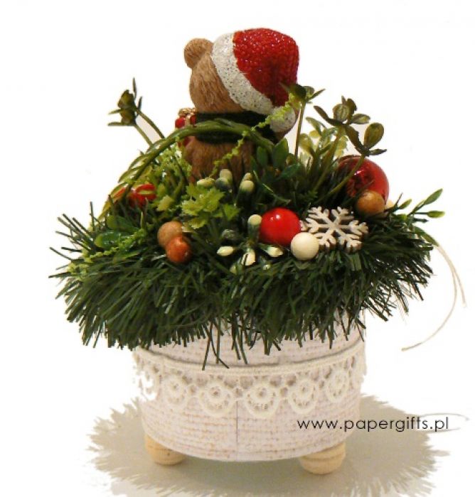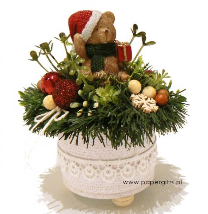 Przepiękna ozdoba bożonarodzeniowa z figurką z żywicy w kształcie Misia z prezentem. Dekoracja świąteczna wykonana na metalowej podstawie oklejonej papierem z motywem bielonego drewna i bawełnianą koronką. Ozdobiona sztucznym łańcuchem, bombkami, zielonymi gałązkami, czerwonymi i białymi kuleczkami. Idealna jako ozdoba świątecznego stołu, firmowego biurka lub jako dodatek do prezentu dla bliskiej osoby. Wysokość stroika z dekoracjami ok. 15 cm, średnica podstawy ok. 7 cm.
