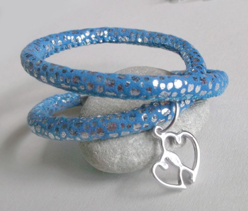 Bransoletka dwa razy owijana wokół nadgarstka, wykonana z mięciutkiego, szytego rzemienia o zamszowym wykończeniu i z połyskliwym wzorem). Zawieszka -serce. Na nadgarstek 15,5 - 17 cm. Wygodne i ładne zapięcie na magnes.