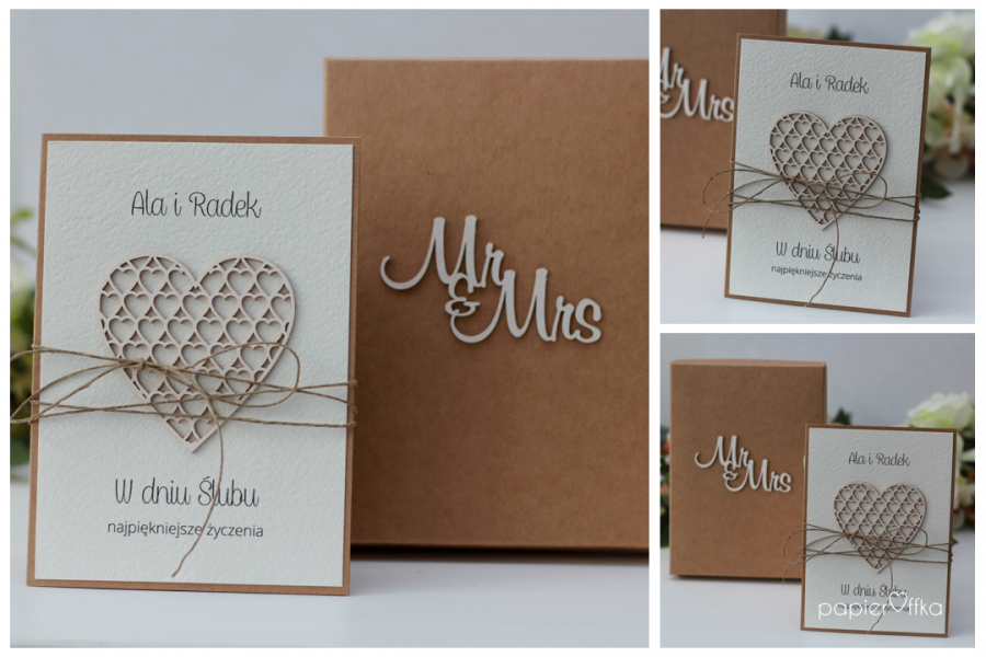 Stylowe pudełko z kartką na ślub. Możliwość nadruku życzeń - proszę o podanie tekstów w zamówieniu. Zastrzegam możliwość zmiany napisów serca - zawsze po wcześniejszym uzgodnieniu.