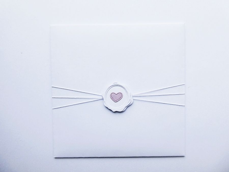 W komplecie jest elegancka biała koperta, która została przyozdobiona podobnie do kartki - opleciona dekoracyjnym sznurkiem z papierową pieczęcią.