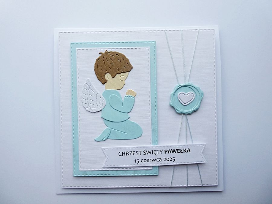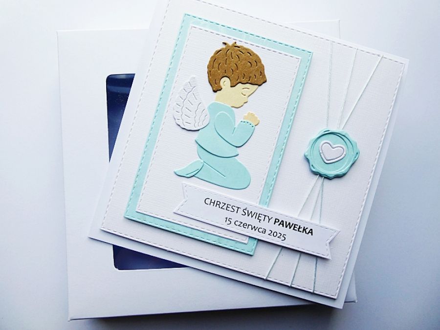 Kartka utrzymana została w biało-niebieskiej kolorystyce, a zdobi ją modlący się aniołek, który jest symbolem Bożej opieki nad dzieckiem.