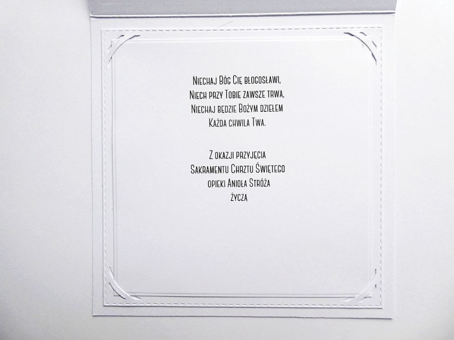 Kartka jest personalizowana - imię dzieciątka i data uroczystości na froncie oraz gotowe życzenia w środku.