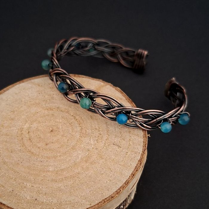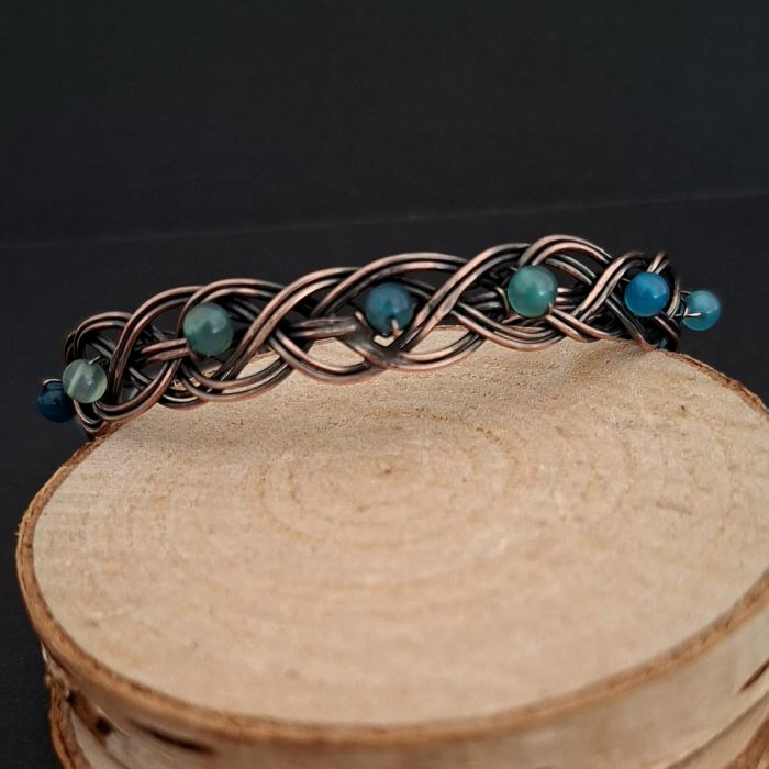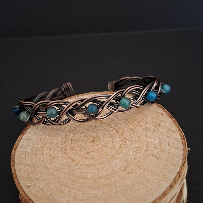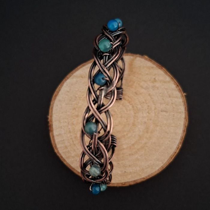 Ręcznie pleciona bransoletka damska. Powstała z miedzi i małych błękitnych jadeitów. Całość oksydowana i polerowana. Rozmiar regulowany.