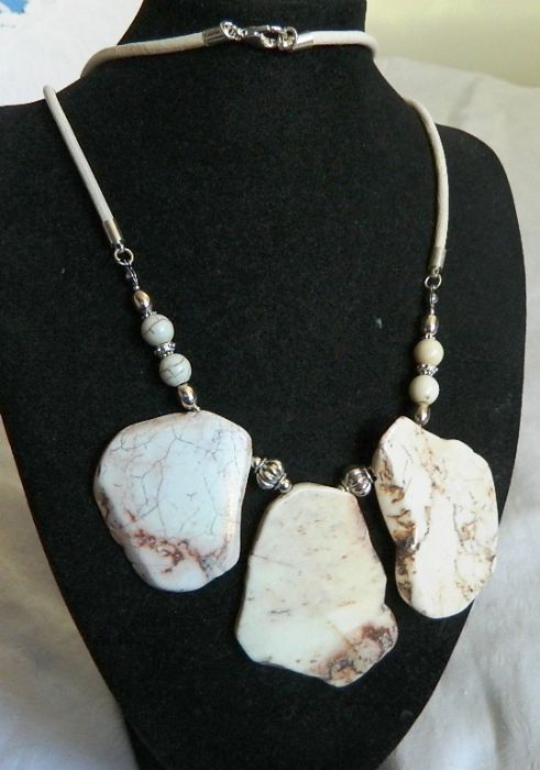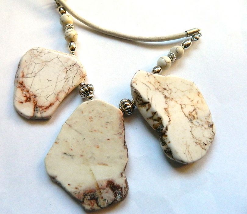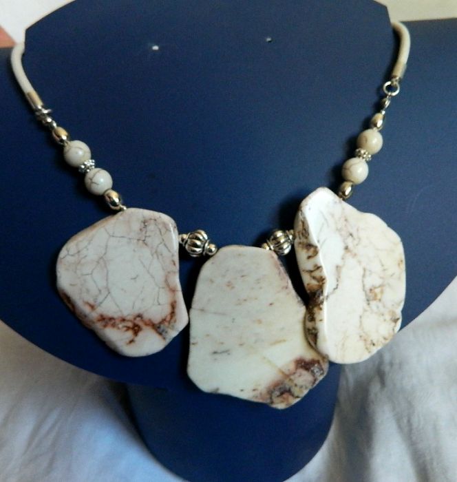 Naszyjnik wykonany z naturalnych białych howlitów - są to nieregularne, duże plastry. (każdy ma około 5x4cm) i klasyczne kuleczki z tego samego kamienia. Charakterystyczne "żyłki" upodabniają go do turkusu. Każdy trochę inny...jak to w naturze:)