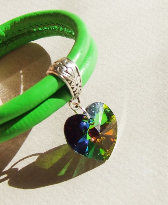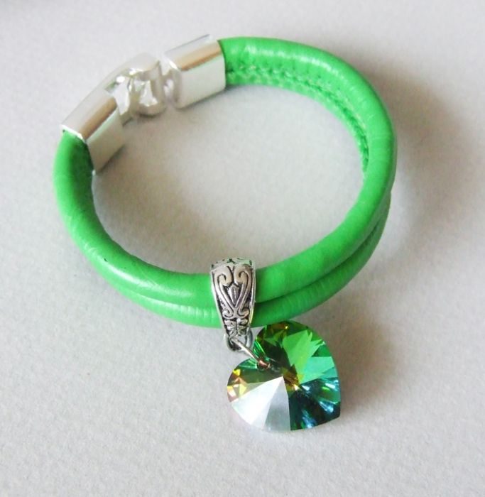 Modna, podwójna bransoletka wykonana z mięciutkiego, grubego, szytego rzemienia w kolorze jasnej zieleni. Zapinana na bardzo wygodne zapięcie i ozdobiona sercem w kolorze vitrail medium (Swarovskiego) - 18mm i ładną krawatką. Będzie pasować na nadgarstek 15 -15,5 cm.