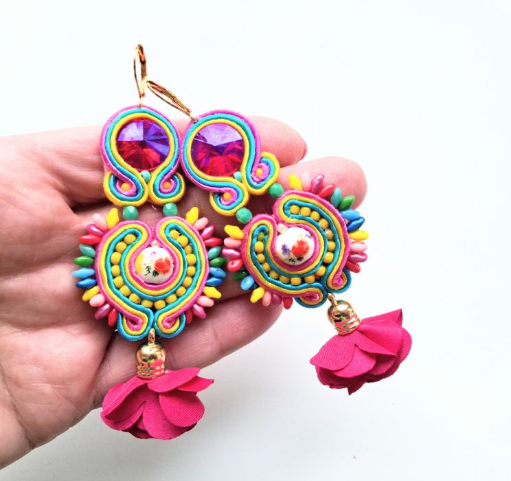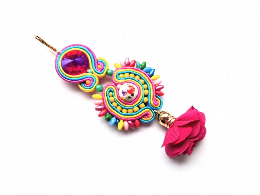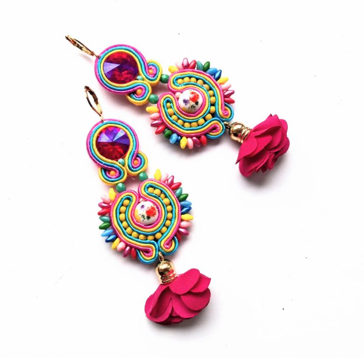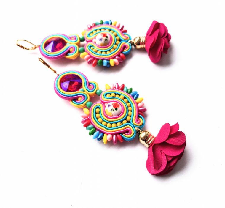Kolczyki wykonane w modnej technice haftu sutaszowego. Jest ona pracochłonna, ale daje piękne efekty.