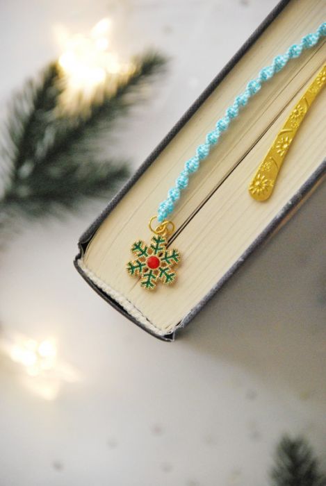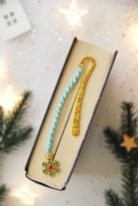 Zakładka powstała na złotej, metalowej bazie z pięknym wzorem. Zawieszka w formie śnieżynki jest przyczepiona do łańcuszka zaplecionego techniką mikromakramy. Błękit i złoto tworzą tutaj niepowtarzalny duet.