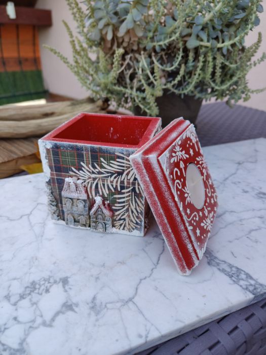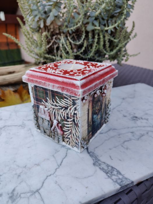 Wyjątkowa ręcznie zdobiona dekoracja do domu, wykonana techniką decoupage. To urocze pudełko w świątecznym stylu może pełnić funkcję świecznika – na jego pokrywce można umieścić świeczkę typu tealight, tworząc ciepły, nastrojowy klimat.
