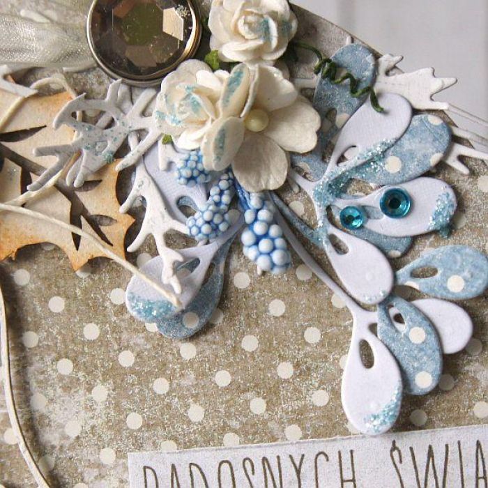 kartka - bombka wykonana z wykorzystaniem profesjonalnych materiałów do scrapbookingu, ozdobione pięknym papierem, delikatnymi tekturkami, półperełkami, brokatem.