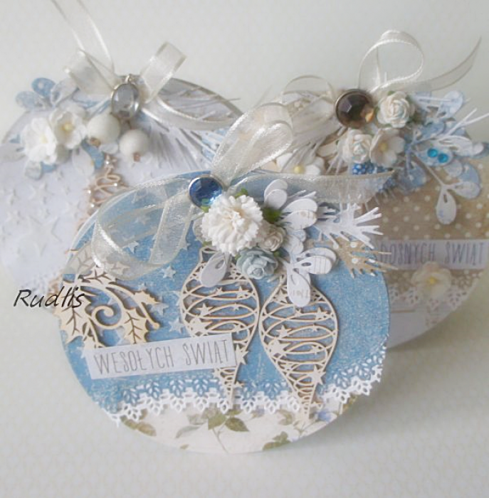 Kartka - bombka wykonana z wykorzystaniem profesjonalnych materiałów do scrapbookingu, ozdobione pięknym papierem, delikatnymi tekturkami, półperełkami, brokatem.