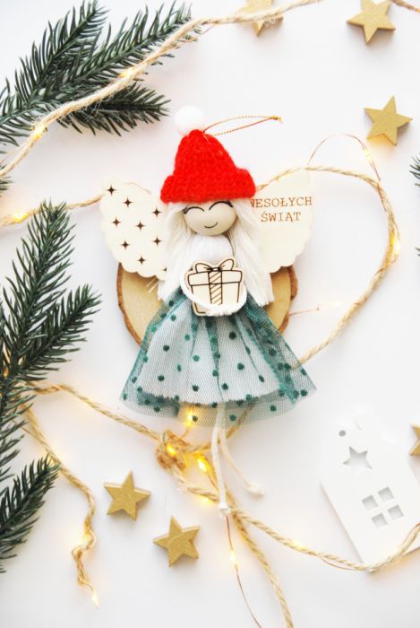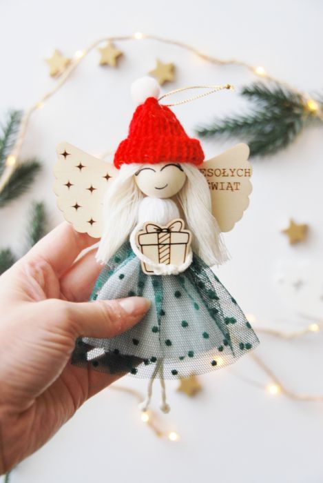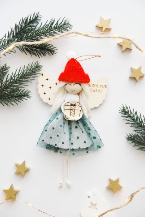 Aniołek ma drewniane skrzydełka z grawerem „Wesołych Świąt” , miękkie włosy z jasnego sznurka oraz czerwoną, dzierganą czapeczkę z białym pomponem. Ubrany jest w sukienkę z tiulem w groszki, a w rączkach trzyma drobny prezent – symbol radości i obdarowywania.