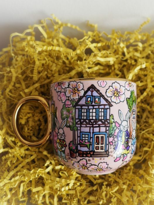 Ręcznie malowany kubek ze świątecznymi królikami będzie doskonałym upominkiem "na zajączka", wyrazi sympatię przy okazji wiosennych spotkań, rozweseli wielkanocny stół.