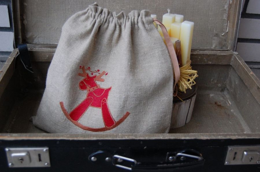 Rustykalny woreczek uszyty z grubego, naturalnego lnu. Na przodzie ozdobiony haftem (haft maszynowy)przedstawiającym tildowego renifera na biegunach. Ściągany z dwóch stron na bawełnianą tasiemkę. Len jako włókno naturalne, przepuszczające powietrze idealnie nadaje się do przechowywania produktów spożywczych, np. świątecznych orzechów itp. Może też być oryginalnym opakowaniem prezentu.