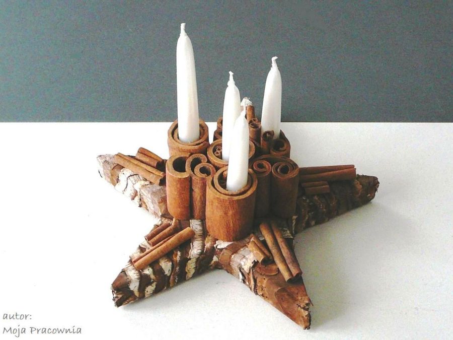 Świąteczna, kremowo-brązowa dekoracja na gwieździstej podstawie, z cynamonem i czterema białymi świecami. Do postawienia na stole, kominku, meblach itp. [Uwaga: Przy zapalaniu świec należy zachować szczególną ostrożność.]