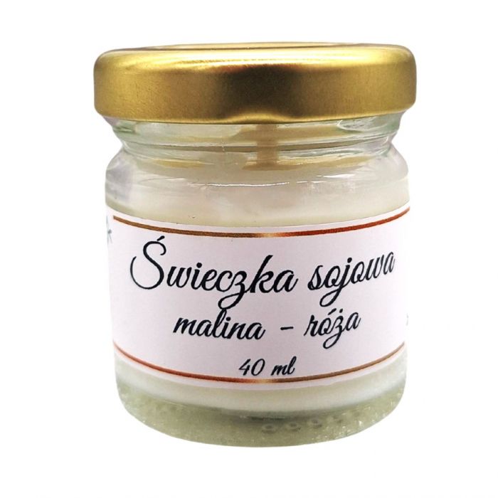 Nazwa produktu: Świeczka Sojowa Malina i Róża 40 ml – Ręcznie Robiona w Szklanym Słoiczku