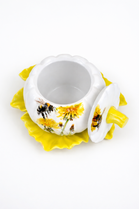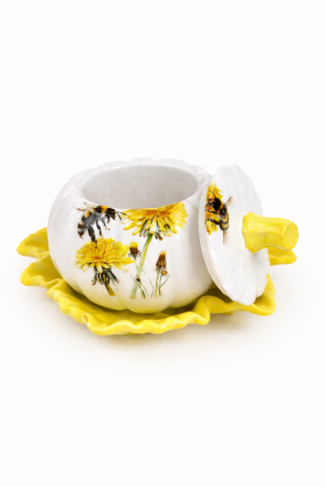 Oryginalny świecznik gipsowy w kształcie dyni ozdobiony ręcznie malowanym motywem pszczoły i kwiatów mniszka. Produkt wykonany ręcznie z wysokiej jakości gipsu dekoracyjnego i umieszczony na eleganckiej podstawce. Każdy egzemplarz jest unikalny i powstaje z dbałością o najmniejsze detale.