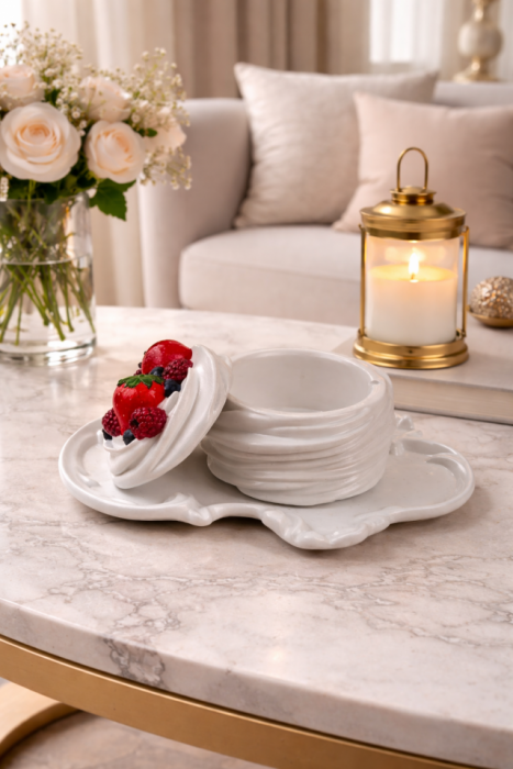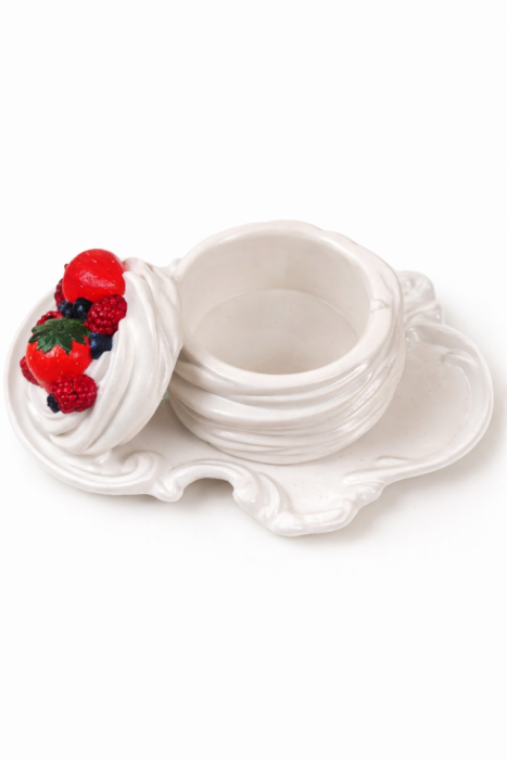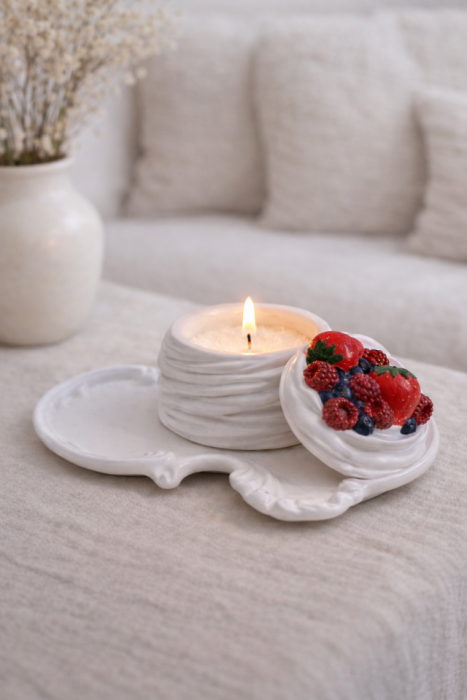 Wyjątkowy gipsowy świecznik inspirowany delikatnym deserem Pavlova, który zachwyca subtelną formą oraz dekoracyjnymi jagodami. Produkt został ręcznie wykonany z dbałością o detale, dzięki czemu wyróżnia się eleganckim i przytulnym charakterem.