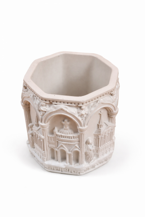 Malowane, Modelowane,Dekoracyjny gipsowy świecznik inspirowany rzymską architekturą, z detalami łuków i kolumn. Idealny do świec dekoracyjnych, wprowadza do wnętrza elegancję i klasyczny charakter.