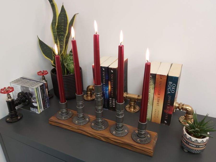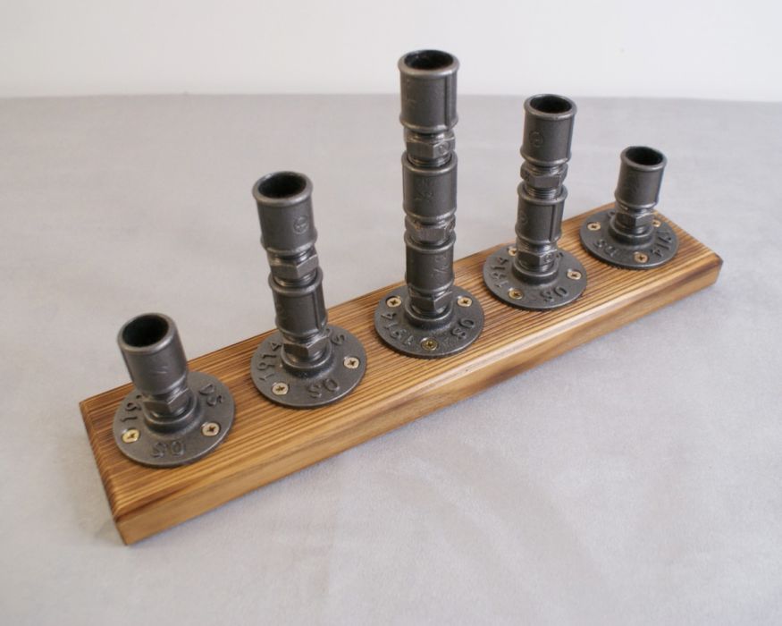 Przedstawiamy ręcznie wykonany świecznik w połączeniu dwóch stylów: industrialnego z uwagi na wykorzystanie stalowych rur hydraulicznych oraz stylu loftowego dzięki ciepłu jakie daje nam postarzałe lakierowane drewno.