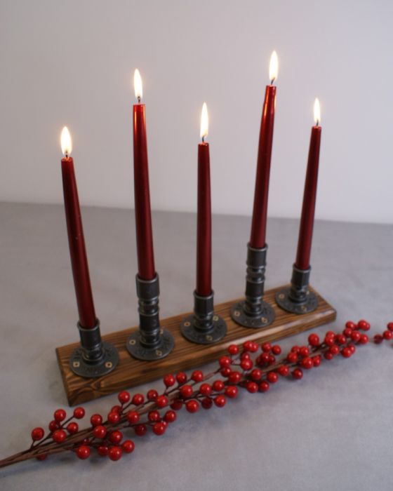 Przedstawiamy ręcznie wykonany świecznik w połączeniu dwóch stylów: industrialnego z uwagi na wykorzystanie stalowych rur hydraulicznych oraz stylu loftowego dzięki ciepłu jakie daje nam postarzałe lakierowane drewno.