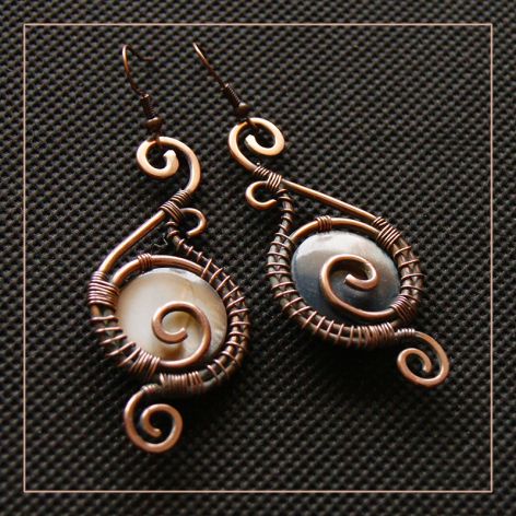 Te kolczyki inspirowane morską fauną wykonane techniką wire wrapping. Wykonane ręcznie z miedzi, misternie oplecione z dodatkiem pastylek z masy perłowej. To biżuteria dla miłośników stylu vintage, historii i kunsztownej ręcznej pracy. Ta para jest jedyna w swoim rodzaju, jak opowieść, która czeka na nowego właściciela.