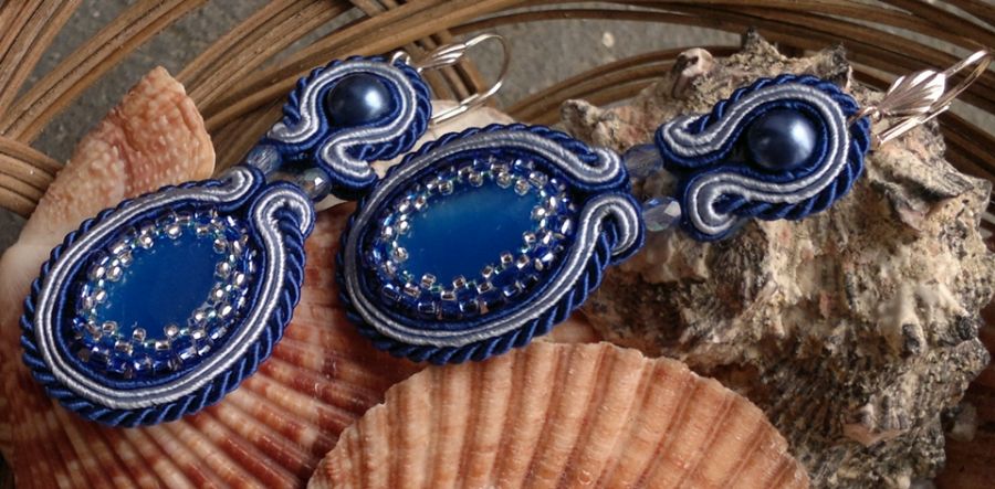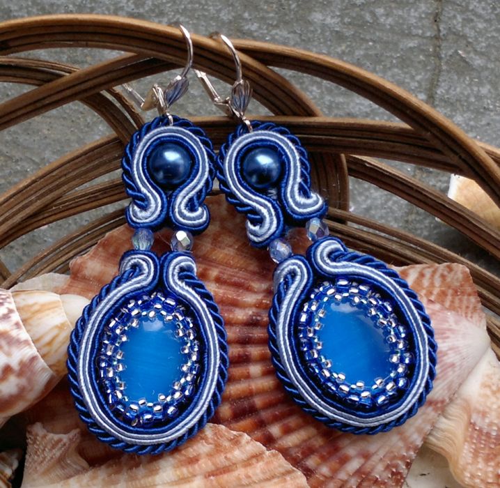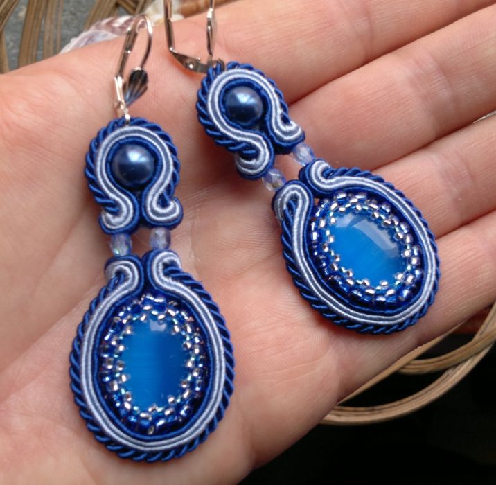 Centrum pięknych kolczyków jest szafirowe kocie oko którego otaczają srebrzyste koraliki TOHO w szafirowych odcieniach. Piękny obraz dopełniają koraliki Fire Polish, perełki kulki i sznurki sutasz w odcieniach szafirowym i niebieskim.