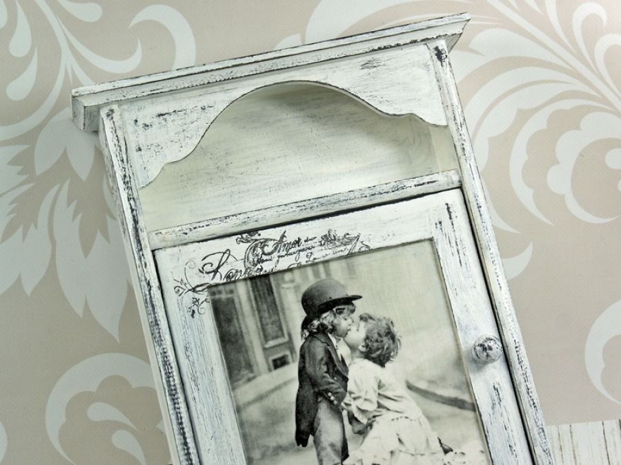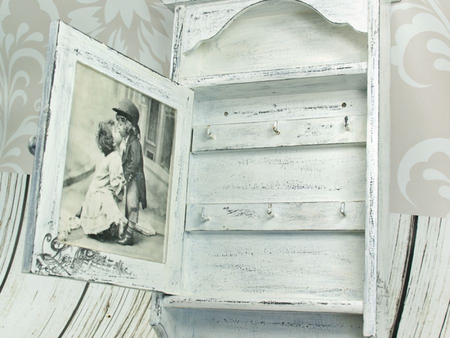 Duża drewniana szafka na klucze. postarzana przecierkami, ozdobiona romantycznym motywem .