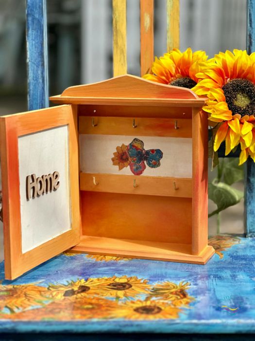 Szafka powstała z drewna sosnowego, ma wymiary: 25 cm x 22 cm, wewnątrz ma dwa rzędy na klucze.