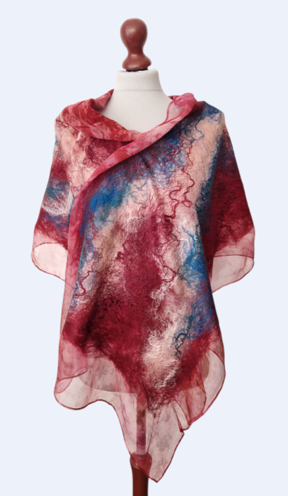 Doświadcz idealnego połączenia luksusu i natury. Ten wyjątkowy, ręcznie wykonany szal został wykonany techniką Nuno Felting, w której miękkie włókna wełny merynosów są skrupulatnie łączone z delikatnym, naturalnym jedwabiem. Efekt? Lekki, oddychający i niezwykle miękki w dotyku element sztuki użytkowej.