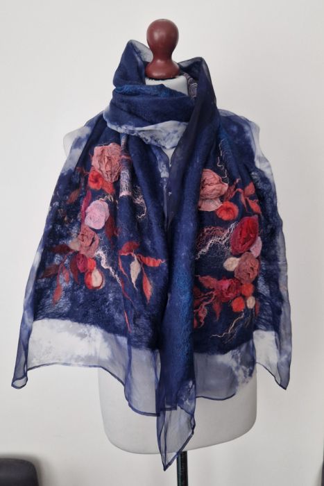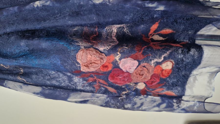 Doświadcz idealnego połączenia luksusu i natury. Ten wyjątkowy, ręcznie wykonany szal został wykonany techniką Nuno Felting, w której miękkie włókna wełny merynosów są skrupulatnie łączone z delikatnym, naturalnym jedwabiem.