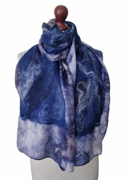 Ręcznie filcowany szal wykonany z jedwabiu oraz delikatnej wełny z merynosów australijskich. Piękny i unikalny. Ozdobiony jedwabnymi włóknami. Zwiewny, lekki, delikatny i niegryzący. Można nosić go niedbale owiniętym wokół szyi jak i zarzuconym na ramiona.