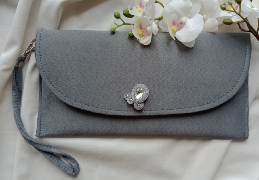 Torebka z zamszu alkantara, szyta w Polsce (made in EU). Zapinana na ukryty zatrzask, ma dopinany pasek na nadgarstek.