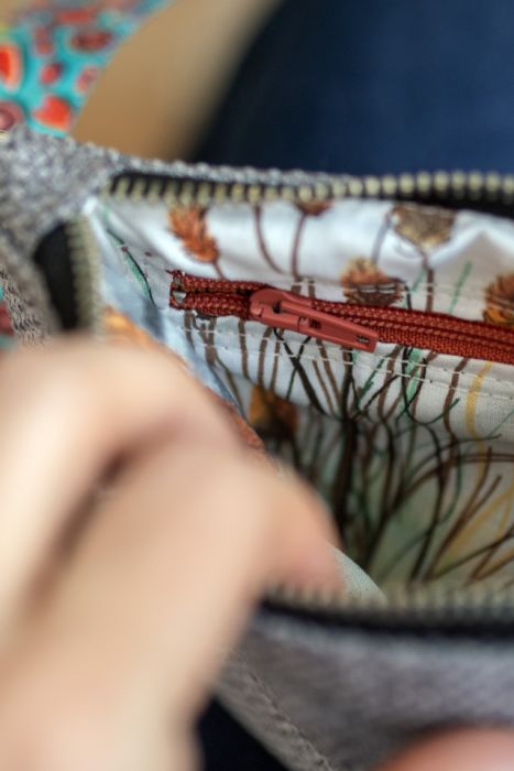 Małe zaszewki na dnie. Z tyłu oraz w środku torebki kieszonki zapinane na suwak. Środek wykończony bawełnianą podszewką.