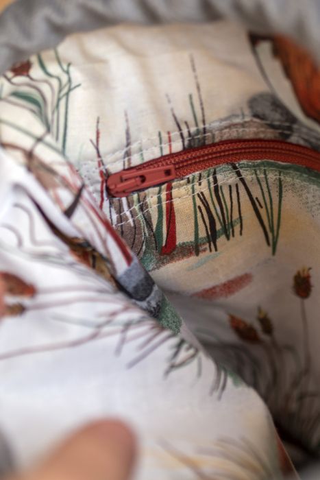 Wykonana z szarego weluru. Z przodu oraz z na tyle torebki kieszenie (np. na telefon czy chusteczki) z kilku rodzajów tkanin tworzących wspólnie ciekawą wizualnie całość. Stworzona w duchu no waste.