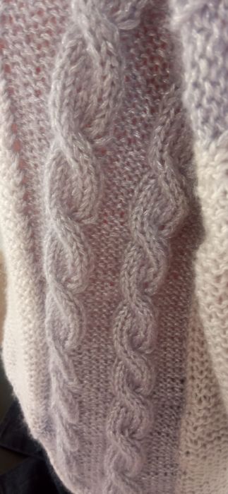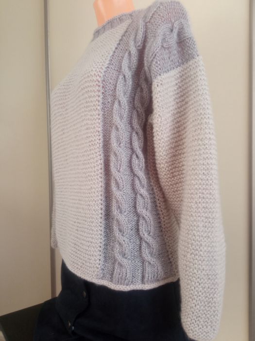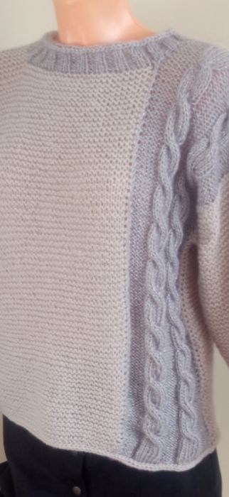 Sweter wykonany ręcznie na drutach z włóczki o składzie 80% akryl i 20% wiskoza. Ciemniejsza wstawka z warkoczami to włóczka z błyszczącą srebrną nitką.