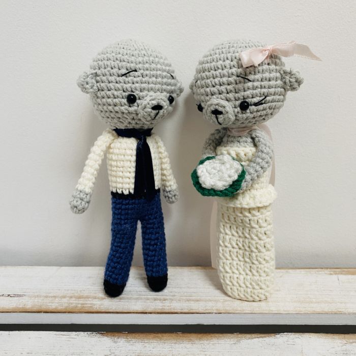 Młoda Para - misie maskotki, wykonane ręcznie na szydełku z wysokiej jakości bawełny i akrylu anti-pilling (niemechacący się) z certyfikatem OEKO-TEX Standard 100, wypełnione antyalergicznym wkładem poduszkowym.