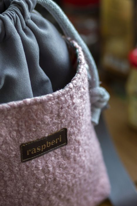 Wykonana z szarej tkaniny. Z przodu oraz z na tyle torebki kieszenie (np. na telefon czy chusteczki) z różowego "baranka". W środku kieszonka zapinana na suwak.
