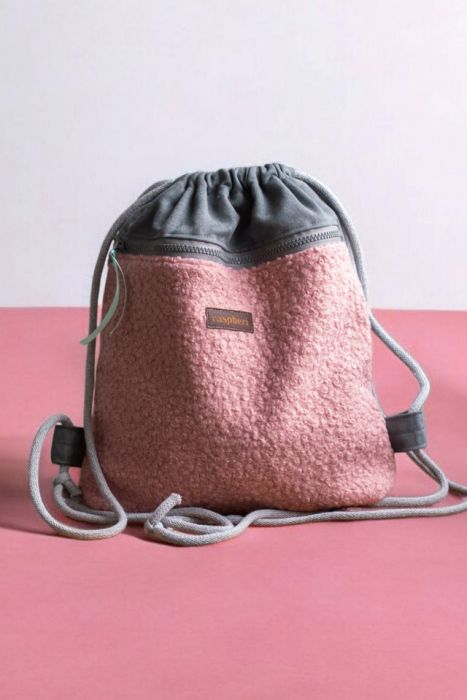 Plecak worek wykonany z szarej tkaniny. Z przodu duża kieszeń zapinana na suwak z różowej tkaniny typu baranek. Z tyłu plecaka (z boku, na dole) mała zapinana kieszonka.