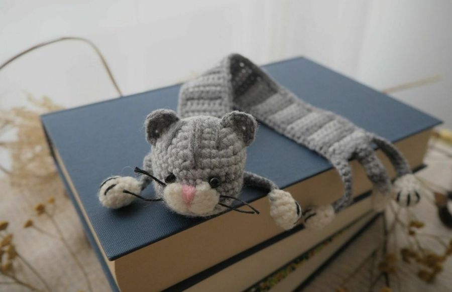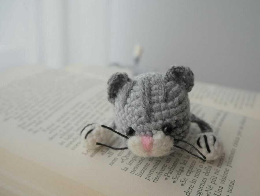 Zakładka do książki z sympatycznym kotem wykonana z włóczki na szydełku.