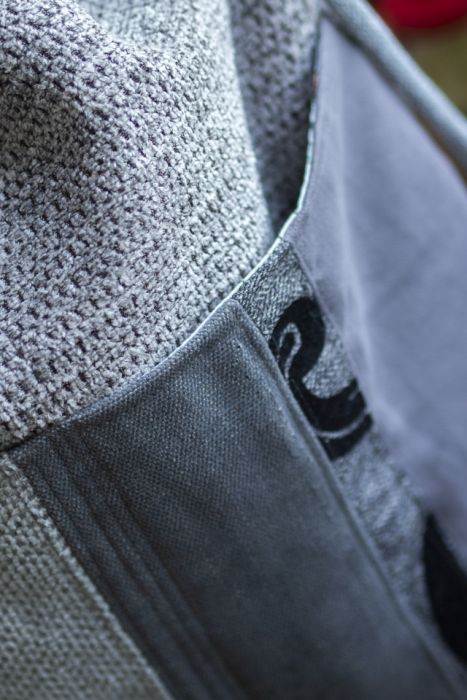 Workoplecak z plecionej tkaniny w kolorze szarym.