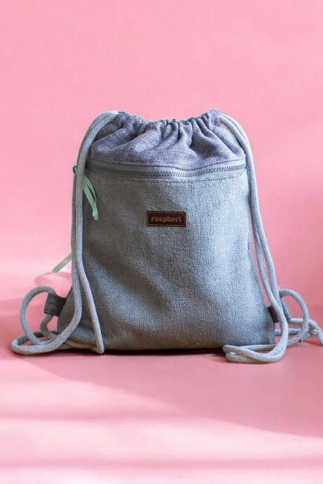 Plecak worek wykonany z szarej tkaniny. Z przodu duża kieszeń zapinana na suwak. Z tyłu plecaka (z boku, na dole) mała zapinana kieszonka.