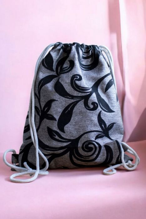 Plecak worek wykonany z szarej tkaniny o widocznym splocie w czarne wzory.