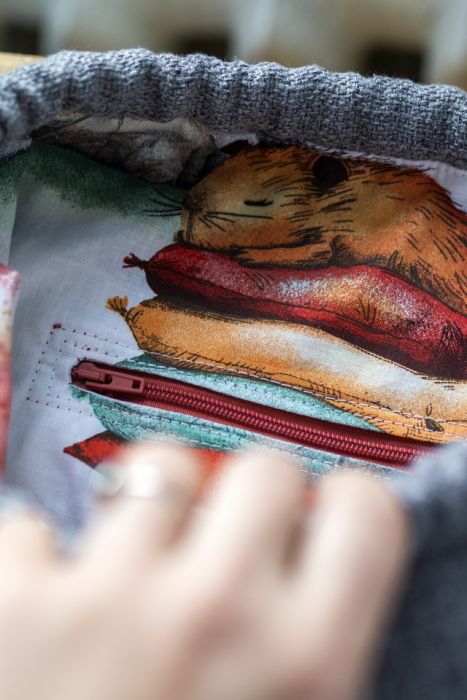 W środku plecak posiada kieszeń zapinaną na suwak. Wykończony jest bawełnianą podszewkę w kapibary.