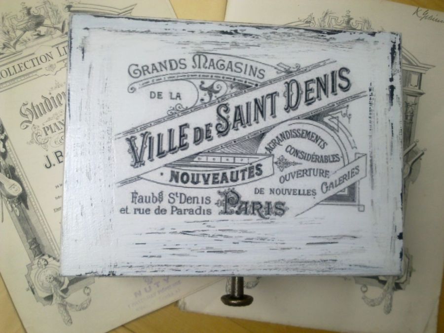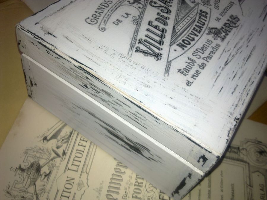 Wyjątkowa szkatułka na biżuterię, wykonana w stylu shabby chic. Celowo wielokrotnie przecierana, aby uzyskać efekt starej, zniszczonej skrzynki. Na wieku grafika paryska -bardzo modny element. Z przodu elegancki uchwyt. W środku malowana na biało. Całość wielokrotnie lakierowana.