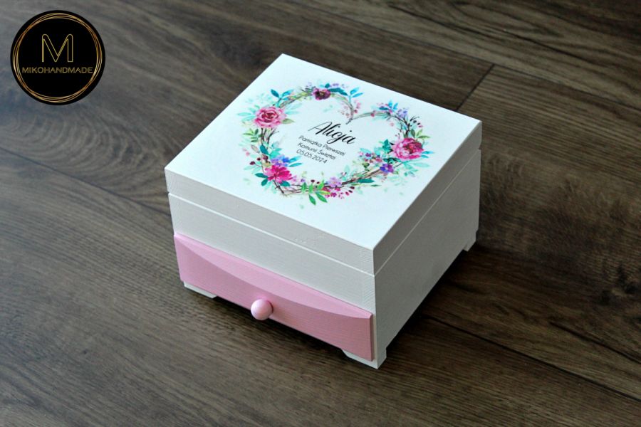 Wyjątkowa, ręcznie zdobiona szkatułka, która zachwyca delikatnością i dbałością o detal. Wykonana z drewna, pomalowana na biało, z urokliwą różową szufladką, która dodaje jej świeżości i dziewczęcego uroku.
