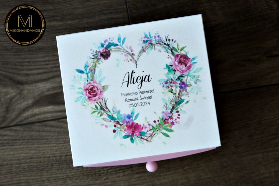 Na wieku znajduje się subtelny kwiatowy wzór w kształcie serca – idealny jako symbol miłości, pamięci i dobrych życzeń. W środku szkatułka wyposażona jest w praktyczne lusterko, a pod spodem kryje się pojemna szufladka na drobne skarby.