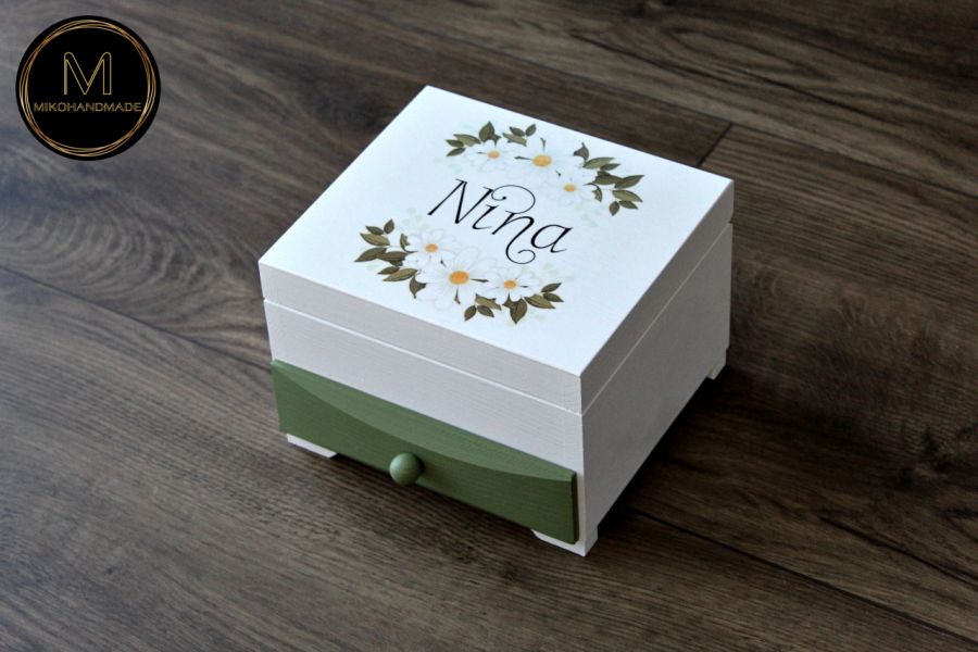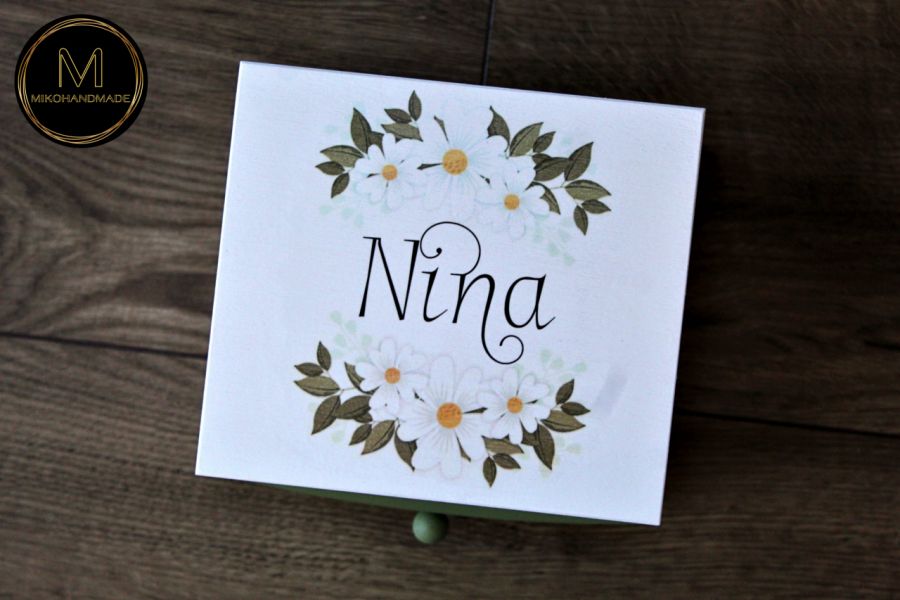 Na wieku, w subtelnej ramce, możemy umieścić dowolne imię lub krótką dedykację (na zdjęciu przykładowa personalizacja: Nina). To właśnie ten detal sprawia, że szkatułka staje się wyjątkowa i niepowtarzalna.