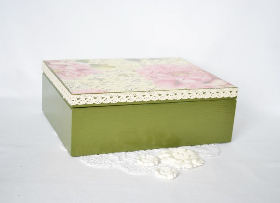 Pudełko drewniane ozdobione zostało z wykorzystaniem techniki decoupage zawiera 6 przegródek różnej wielkości. Całość zabezpieczona lakierem akrylowym