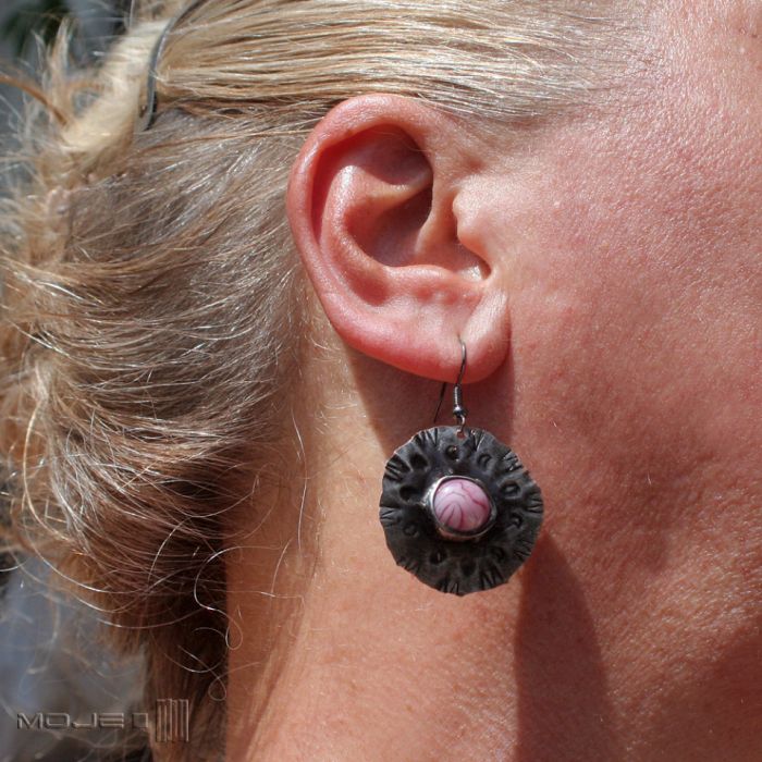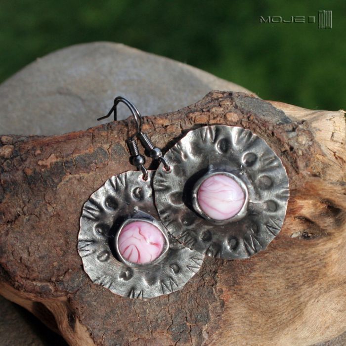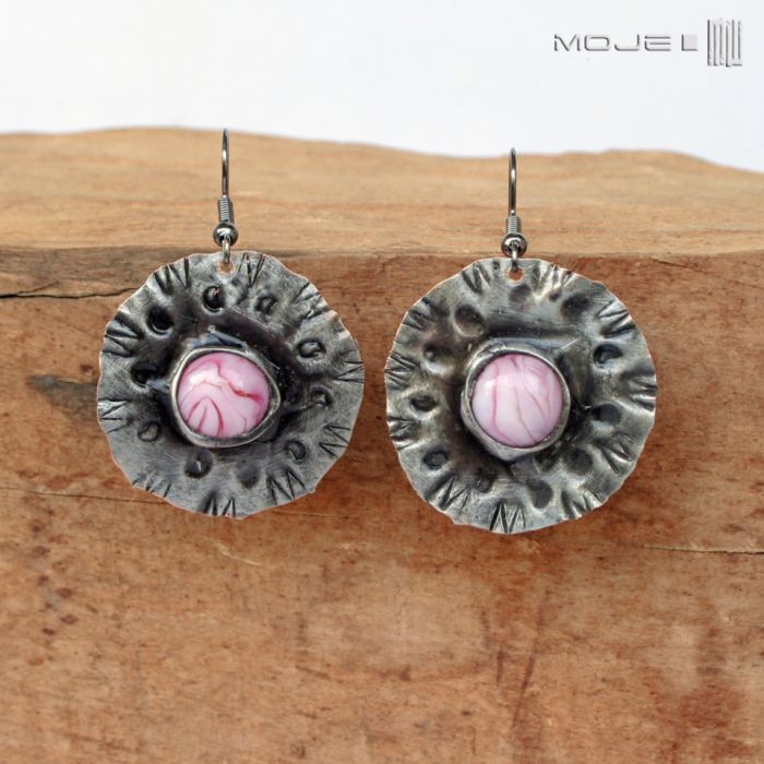 Miedziane okrągłe kolczyki ze szklanym okiem w kolorze bladego różu. Miedziana blaszka z wybitymi znakami - młotkowana, cynowana, patynowana i przecierana. Blaszka jest cienka, a kolczyki dzięki temu lekkie. Metalowe bigle.